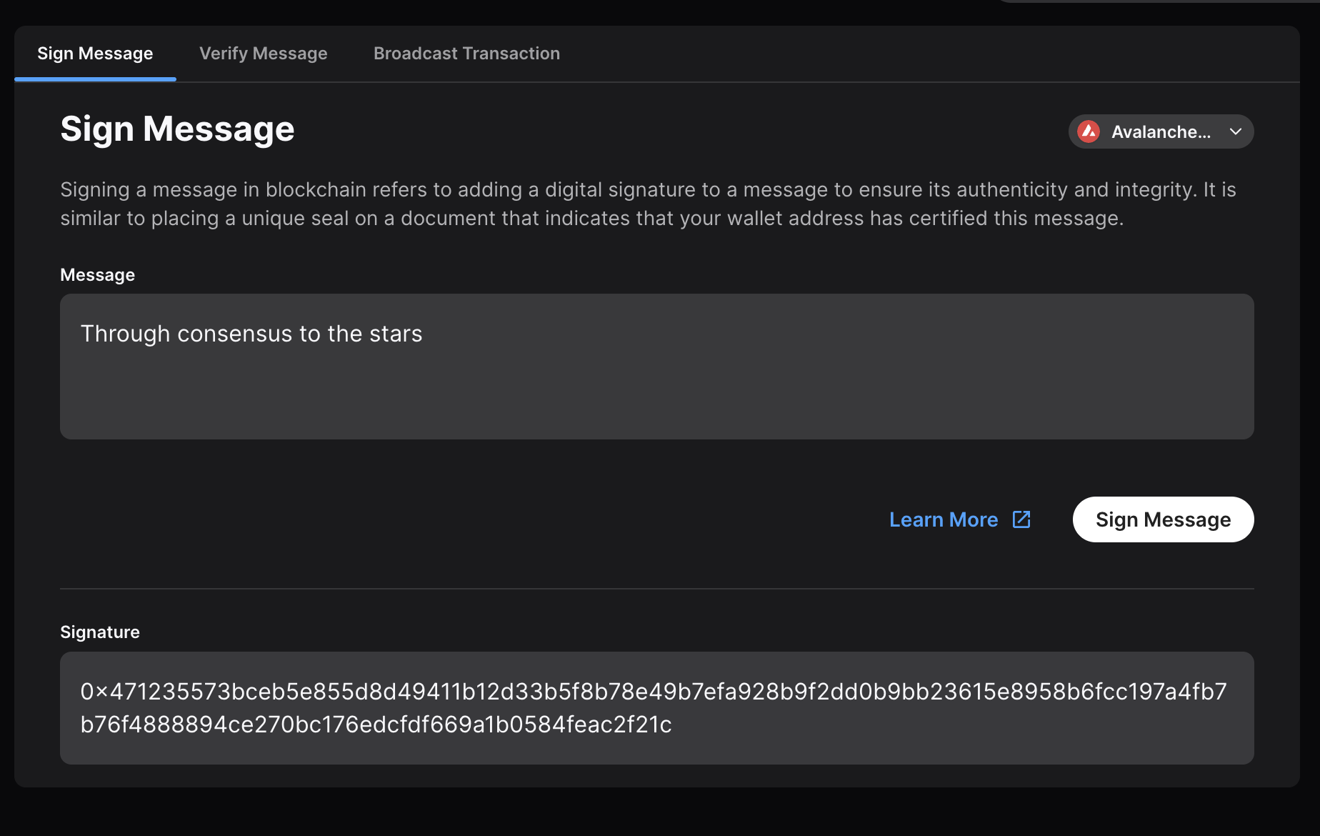 As an example we will sign the message "Through consensus to the stars"